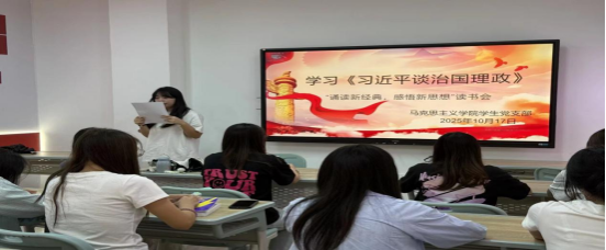 2025年10月17日,马克思主义学院学生党支部于“一站式”学生服务中心开展“诵读新经典 感悟新思想”第二十二期读书会。本次活动由支部书记张秋丹主持,全体在校党员、发展对象和部分入党积极分子参与。
