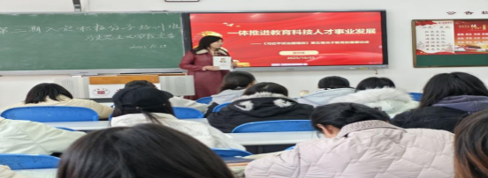 杨方旭书记以“一体推进教育科技人才事业发展”为主题,围绕《习近平谈治国理政》第五卷中关于教育、科技、人才“三位一体”发展的战略意义展开讲解,深刻阐释了三者协同推进的内在逻辑。结合专业实际,她勉励入党积极分子要筑牢专业根基,将理论学习与实践探索相结合,主动肩负起未来作为一名教师的使命担当。
